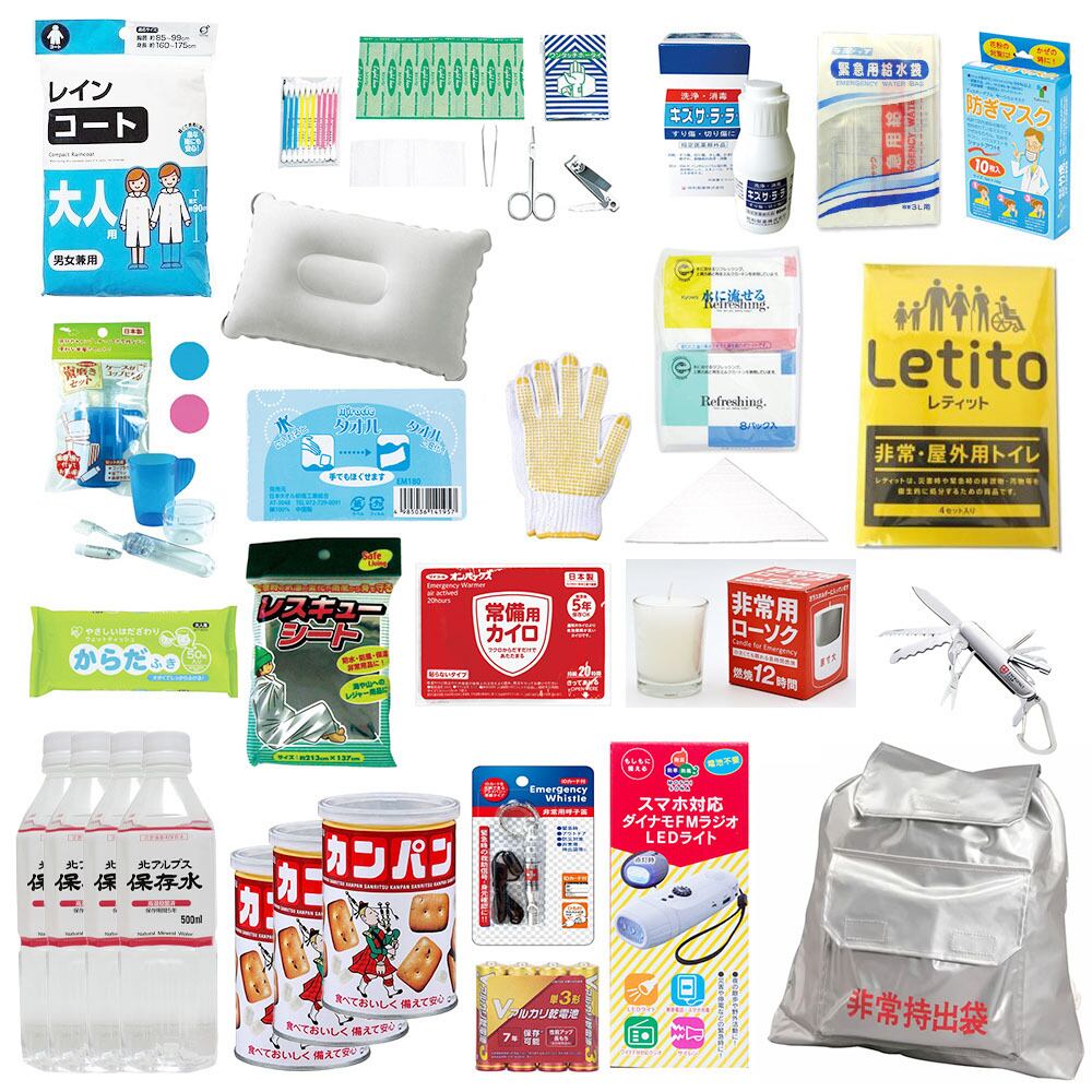 ・非常用持出袋・給水袋(3L)・レスキューシート・緊急呼子笛・軍手・簡易救急セット・消毒液・レインコート(大人用)・単3形乾電池(4本)・三角巾(Mサイズ)・非常用ローソク・マスク(10枚入)・大判ウェットティッシュ・手回し式充電ラジオ・災害用圧縮タオル・非常、屋外用トイレ レティット(4枚入)・水に流せるポケットティッシュ・多機能ツール・歯みがきセット・カイロ・ミニまくら・保存水(500ml)×4本・カンパン×3個