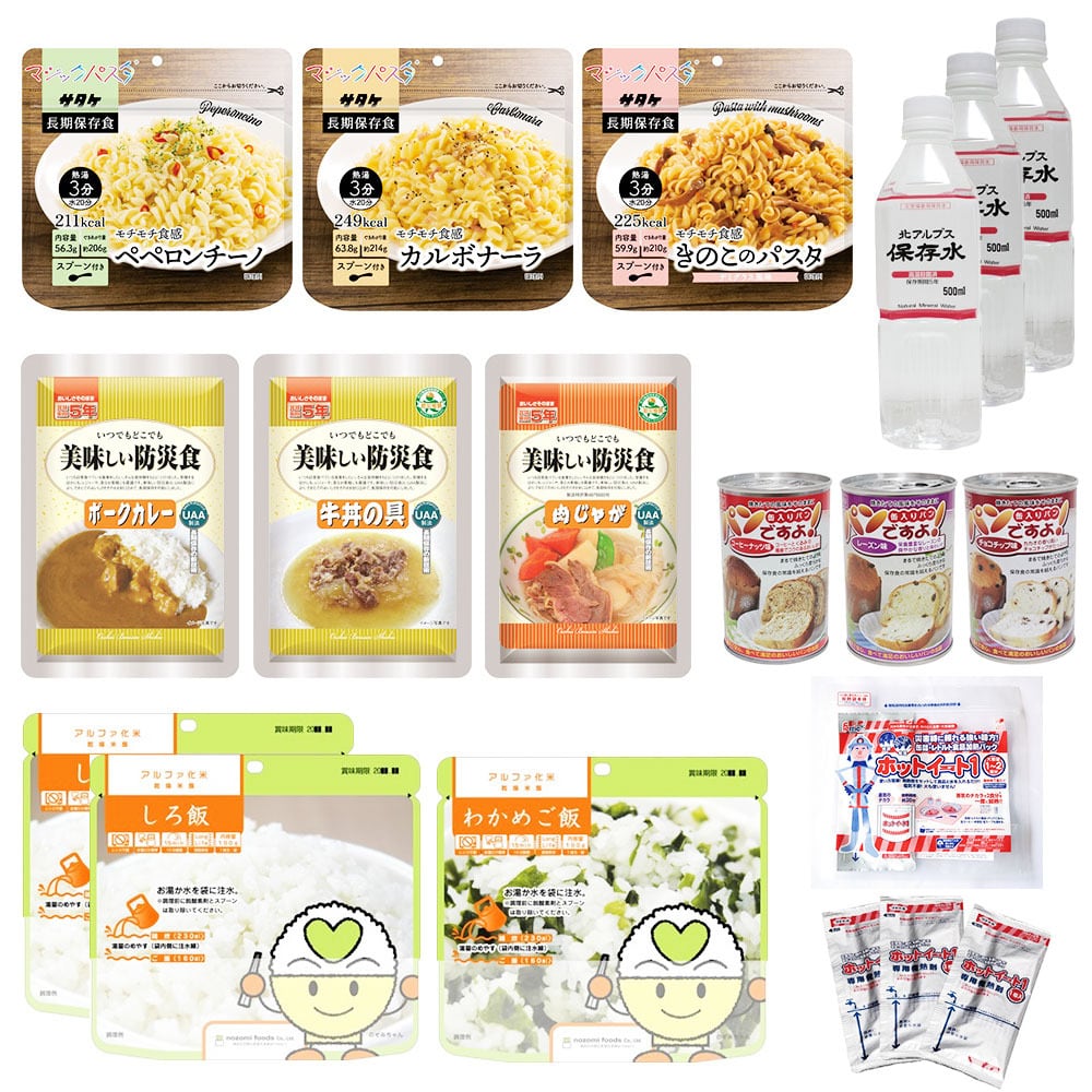 夕食用:アルファ米白米、わかめご飯、おいしい防災食3種