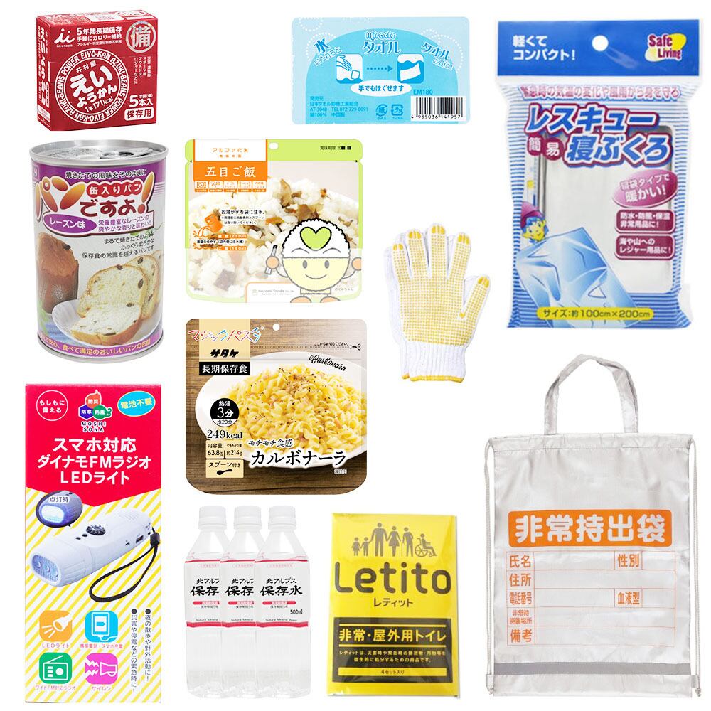 ・非常用持出袋・非常用簡易袋(大人用)・手回し式充電ラジオ・軍手・災害用圧縮タオル・非常、屋外用トイレ レティット(4枚入)・アルファ米五目ご飯・マジックパスタ カルボナーラ